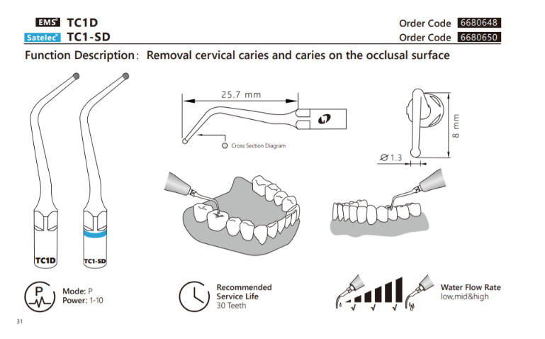 Eighteeth, UltraMint TipTC1D (EMS), Cavity preparation, Stainless steel & Diamond coated.Removal cervical caries and caries on the occlusal surfaceling.