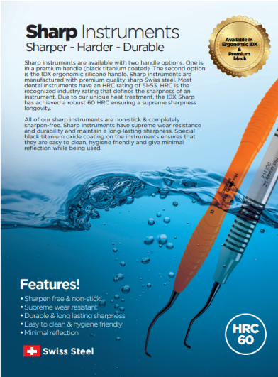 IDX Sharp- Slijpvrij- instrumenten met een titanium oxide gecoate stalen tip die heel lang scherp blijft omdat het veel minder slijt! Kies voor instrumenten die je niet hoeft te slijpen: Sharp van MA Dental.